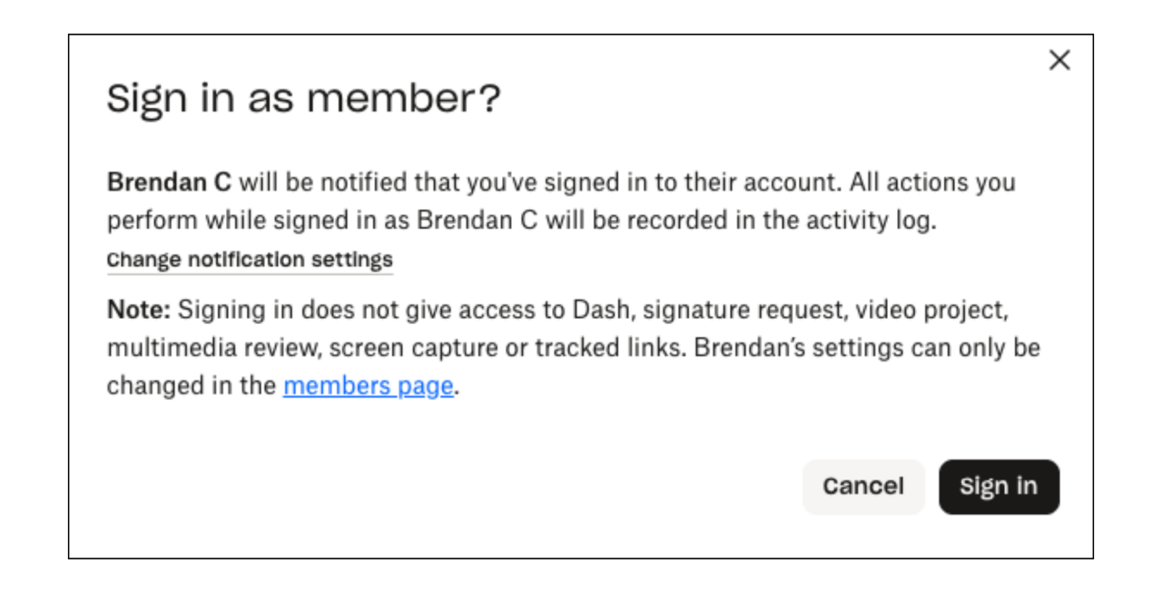 Si usas Iniciar sesión como miembro para acceder a la cuenta de un miembro del equipo, puedes elegir si deseas notificar al miembro del equipo que accediste a su cuenta.