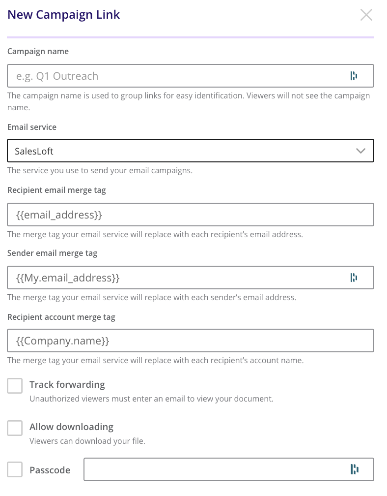 • Recipient Email Merge Tag: This is how the recipient will be identified in DocSend when they visit the Campaign Link. For example, Salesloft’s recipient email merge tag is {{email}}