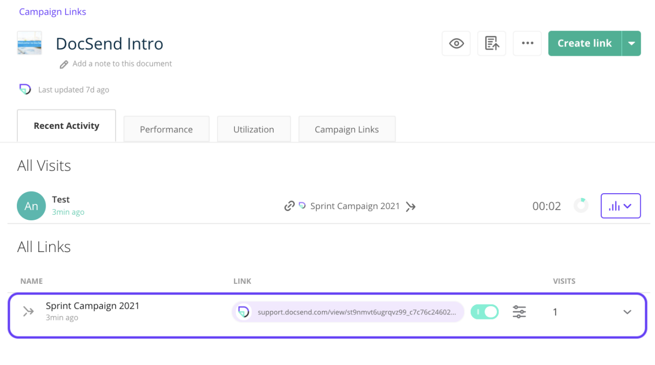 You can also find your campaign links located under the Recent Activity tab of your document page when a visit is initiated. You’ll be able to distinguish a campaign link from a standard DocSend link by looking for a merge icon to the left of the Campaign Name.