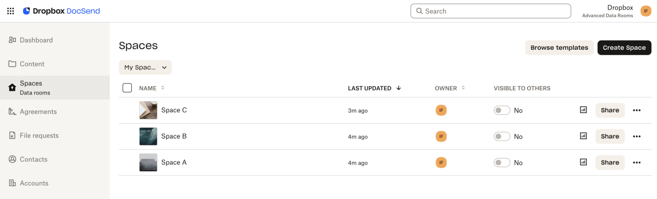 우리는 가상 데이터룸(VDR)을 스페이스라고 부릅니다. 데이터룸은 여러 사람이 모이고, 정리하고, 하나의 링크를 사용하여 콘텐츠를 대량 공유하는 공간입니다. 데이터룸은 팀에서 각 데이터룸을 다양한 요구사항에 맞도록 조정할 수 있는 높은 레벨의 사용자 지정 기능을 제공합니다. 데이터 분석은 소유자와 공동 작업자가 참여와 방문자 활동을 계속 추적할 수 있도록 하는 추가적인 지원을 제공합니다.