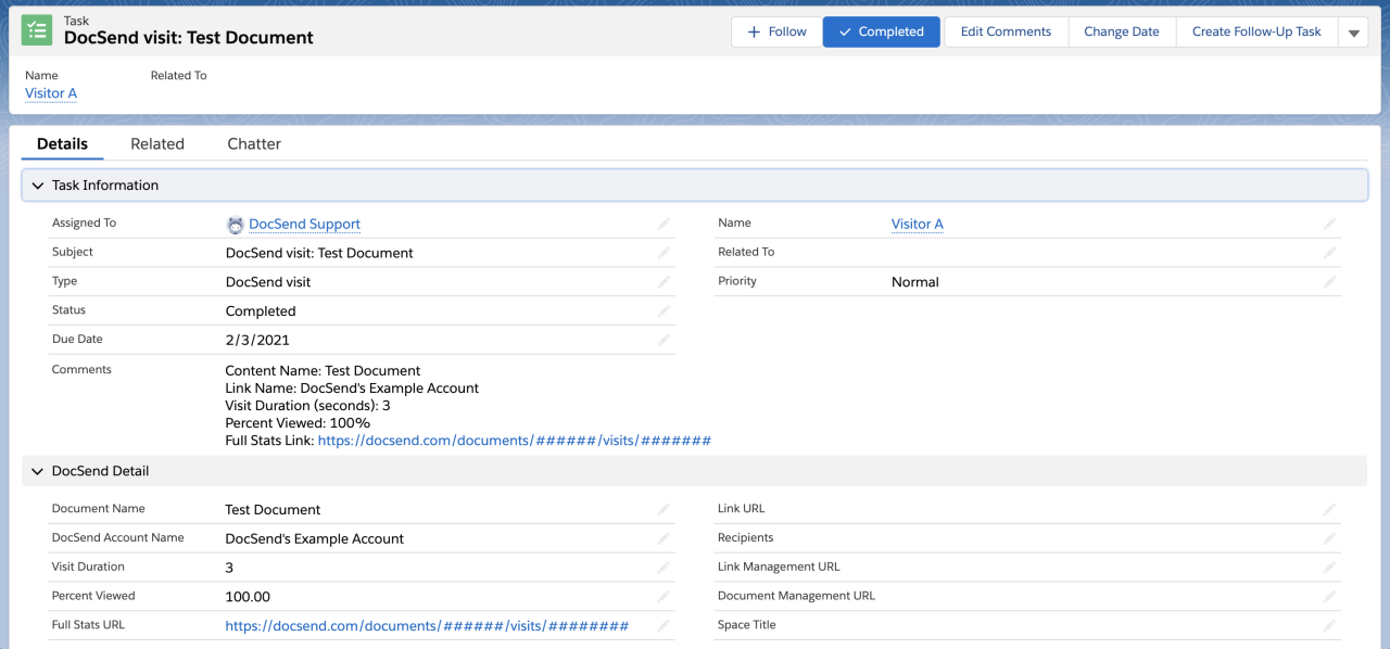 DocSend menyelaraskan ciri berikut pada Tugasan baharu untuk setiap lawatan yang sepadan dengan alamat e-mel pelanggan awal atau kenalan dalam Salesforce: